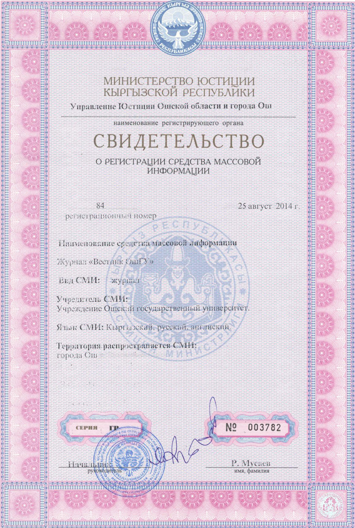Научный журнал «Вестник ОшГУ» основан и зарегистрирован в КП КР с 20.12.2000 г. Входит в список научных журналов рецензируемых ВАК КР. Выпускается 4 раза год. Зарегистрирован в управлении Юстиции Ошской области и города Ош. Свидетельство №003782. Подписной индекс 77396.